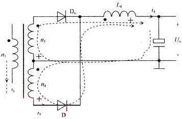 DC-DC改換后的整流管運用了三只:D5,D6和D7,沒有獨立設置續(xù)流二極管,不同于其他電源電路。D5為續(xù)流而設置的復用二極管,D6和是正鼓勵脈沖整流二極管,D7是反鼓勵電壓整流二極管。L4是DC-DC改換后的第一級濾波電感。在正鼓勵期間,變壓器輸出繞組n3經D6,L4輸出電流,第一級濾波電感L4中電流i4增大,同時,變壓器自身利益的鼓勵磁電流i1也在增大。